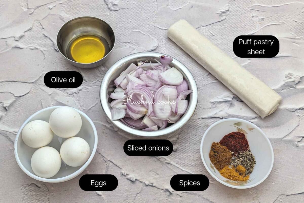 Prepare a spiced onion filling, wrap it with puff pastry and a boiled egg, and bake until golden brown.