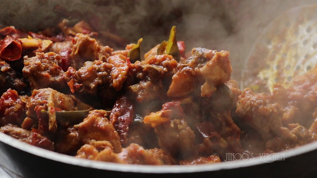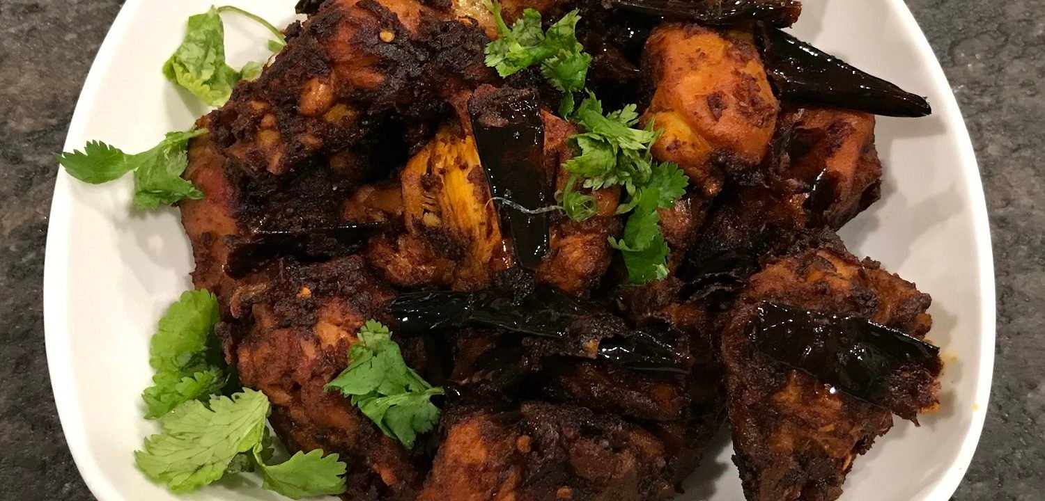 To make it, cook marinated chicken with red chilies, curry leaves, shallots, and coconut in gingelly oil until semi-dry.