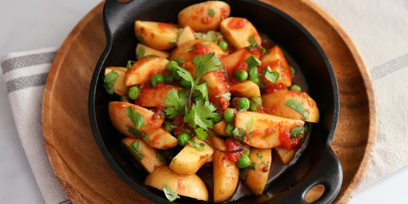 Cook potatoes and peas in a spiced tomato-based gravy until soft and flavorful.