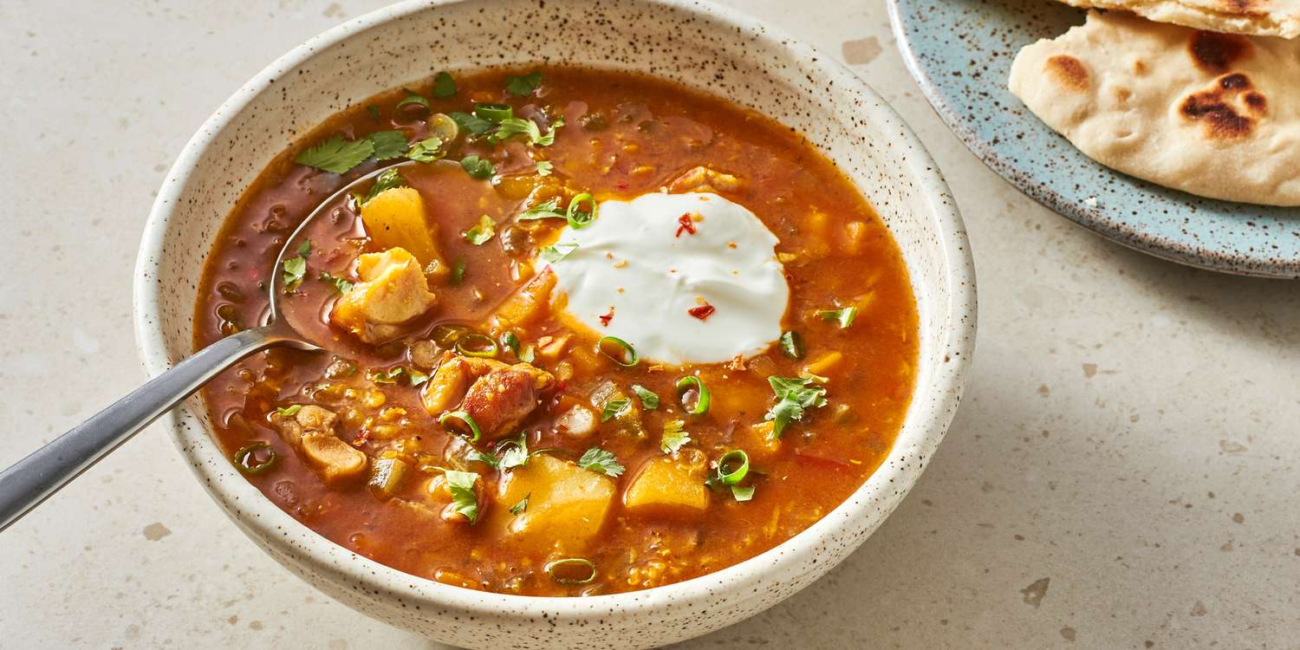It is a spiced soup made with lentils, vegetables, and sometimes chicken, known for its rich texture and warming flavors.